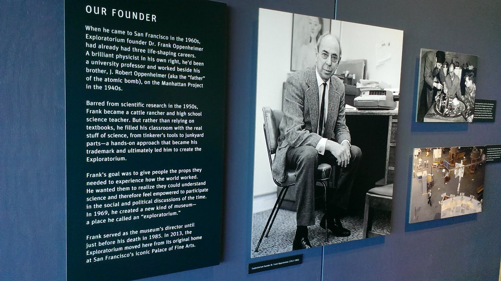 L'Exploratorium est un musée expérimental, à plusieurs titres : je pense qu'il n'y en a que peu (voire pas) d'autres au monde comme lui car les "oeuvres" exposées sont construites par des volontaires, ingénieurs, techniciens, étudiants. Tout ce qui est là "fonctionne" et on demande aux visiteurs de le faire fonctionner pour expérimenter et découvrir eux-mêmes le monde à travers sa réalité physique et matérielle. C'est difficile à décrire, mais on y apprend comment fonctionnent (pêle-mêle) la gravité, la lumière, la diffraction, l'électromagnétisme, le mouvement des marées, la biologie cellulaire, la physique élémentaire, le frottement, le chaud et le froid, les vibrations audibles et inaudibles, le passage du temps, les bizarreries de nos perceptions ...Les photos ne peuvent pas rendre justice à cet endroit étonnant, créé par le physicien Frank Oppenheimer (frère du co-concepteur de la bombe A). J'avais eu la chance de le visiter en 1976 et j'en avais gardé un souvenir très intense. Je n'ai pas été déçu par ma nouvelle visite. Il est en effet beaucoup plus vaste que lorsque je l'ai visité en 1976. Il avait ouvert en 1969 (la photo ci-dessous montre Oppenheimer au milieu de la première exposition du musée ; on l'a déménagé sur le site actuel en 2013. Auparavant, il se trouvait au Palace of Fine Arts, dans le quartier de la Marina (plus à l'Ouest, plus près du Golden Gate Bridge).